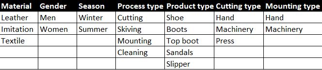 The Independent variable and the production time of 57,600 shoes were finalized for the experiment. The independent variables are provided in the table below and have also been identified in tables in previous sections. Production time is noted in seconds in the dataset.
