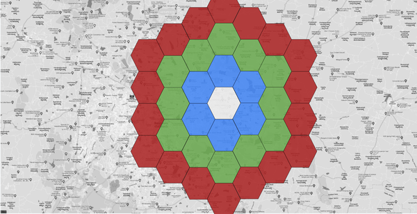 “This library provides hexagon-based hierarchical gridding. Indexing a point means that the point is translated to a geoId, which corresponds to a hexagon. Its neighbors in H3 can be approximated by a ring of hexagons. Direct neighbors have a distance of 1, their neighbors are at a distance of 2, and so on.