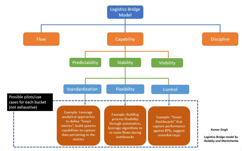 Let us use the Logistics Bridge Model, proposed by Goldsby and Martichenko, to explore how we can think about the big picture when selecting analytics use cases. Please remember that this is just an example. There are multiple ways to think about it, and you can similarly use frameworks developed for other functions to plan your analytics pilot journey.