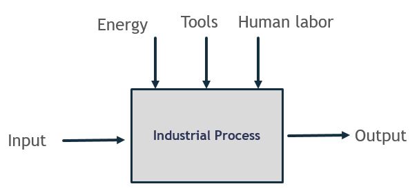 An industrial process can be defined as a set of operations that transform, with a predetermined objective, the properties of one or more materials, types of energy, or information. The industrial process also includes collecting, elaborating, and sharing knowledge along all production phases and steps. A straightforward representation of an Industrial process is illustrated below: