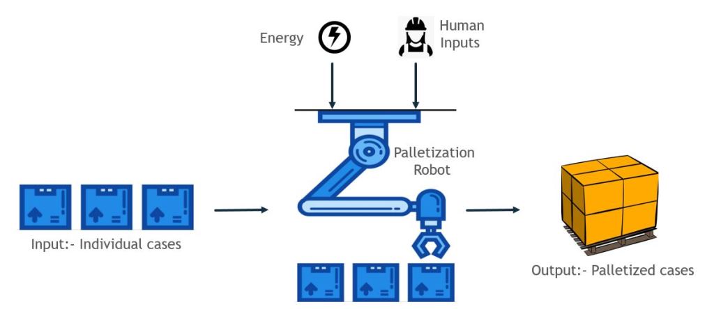 Thinking about industrial processes from an automated DC perspective, a robot station that palletizes cases in a computerized grocery DC is an Industrial process. The cases are the inputs; it consumes electricity, and a human interfaces with its controls. The output is a ready-to-ship pallet.