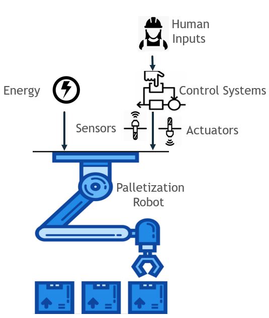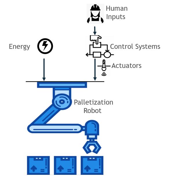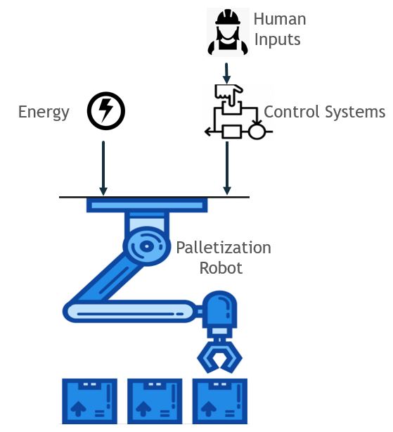 Note that information is another critical type of Input that an Industrial process (palletizing robot in this case) receives. This information can be in various forms, like the electric voltage, fluid pressure, or any other information that can be coded in sequences of binary values.