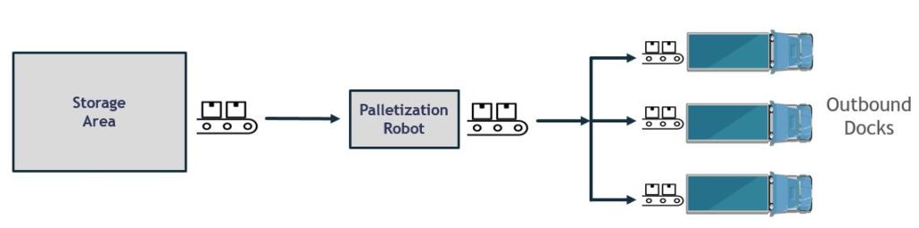 To simplify the example, let us assume this is a DC with only one palletizing robot and three outbound docks. At a high level, the automated pick, pack, and loadprocess in this DC is shown below: