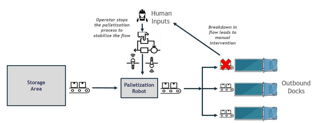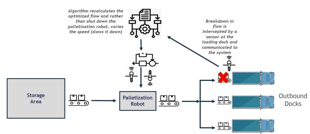 Now let us see how a smart DC would handle this. Sensors at the loading docks would monitor the loading rate and ensure the flow is balanced. As soon as the sensors detect that the loading has stopped at one dock, the operating rate/throughput of the palletization robot will be adjusted. The basis of this adjustment will be calculations done by an algorithm. The output value then gets to the robot via the control system and actuator. No human intervention in a smart DC should be needed for a short-term, minor disruption like this.