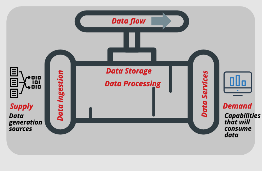 Your data must flow from the source(supply) to the demand, which are the digital capabilities that consume the data. Just like supply chain flows, there are many intermediary entities to aid that flow. You have to formulate your data ingestion capabilities, storage capabilities, and the data services you will need before the data reaches the final consumption point. And as you may have inferred from the first focus area, your corporate strategy elements, which interface with technology strategy, will eventually provide inputs to fill in the canvas in Figure 4.
