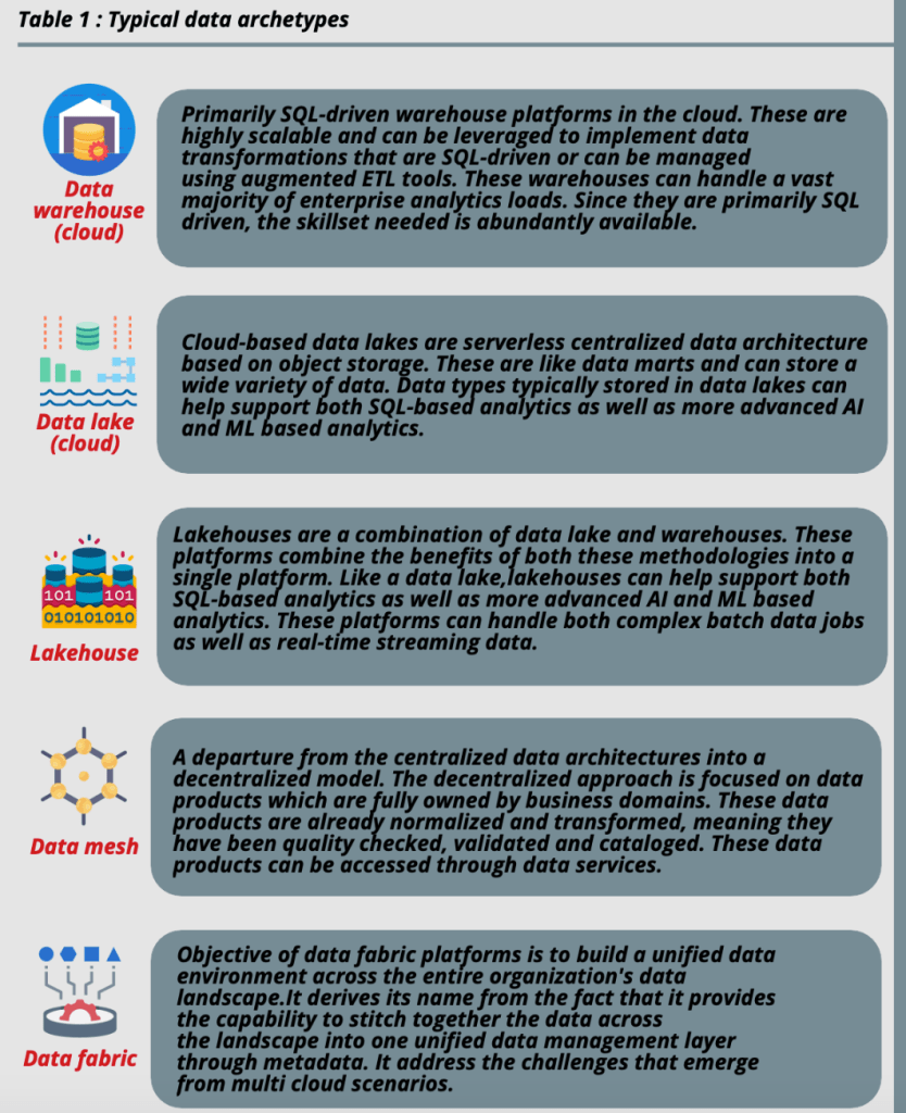 Also, you can leverage more than one archtypes in your overall architecture. Regardless, it is important for you to understand the most commonly leveraged archetypes. Some examples of typical data archtypes have been illustrated in Table 1.