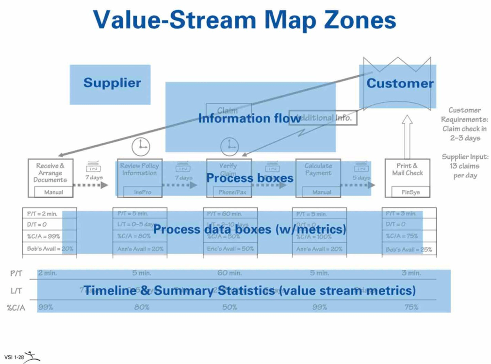 The illustration from Lean Enterprise Institute shows the key pieces of information captured in the value stream analysis process: