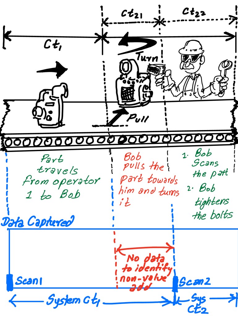 Typically, that movement will be aggregated due to a certain scan or log in the system. The data captured has no visibility into those three movements. The system data has tow sets of time only, thereby embedding the non-value added time inside System ct2. This is the data the process mining solution will capture as well. There is not visibility for the process mining solution into the actual ct21, shown in the figure above. That is the non-value added time.