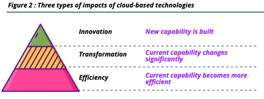 Before we get into the innovation hierarchy, let us understand where innovation sits regarding the three layers of the benefits delivered by the cloud. Figure below provides an overview of the three layers of impact that can be created with the cloud. Please note that this is my perspective, and the definitions may not align with generally agreed definitions. However, these aspects are not science, and we must disagree more with what is “generally agreed” upon.