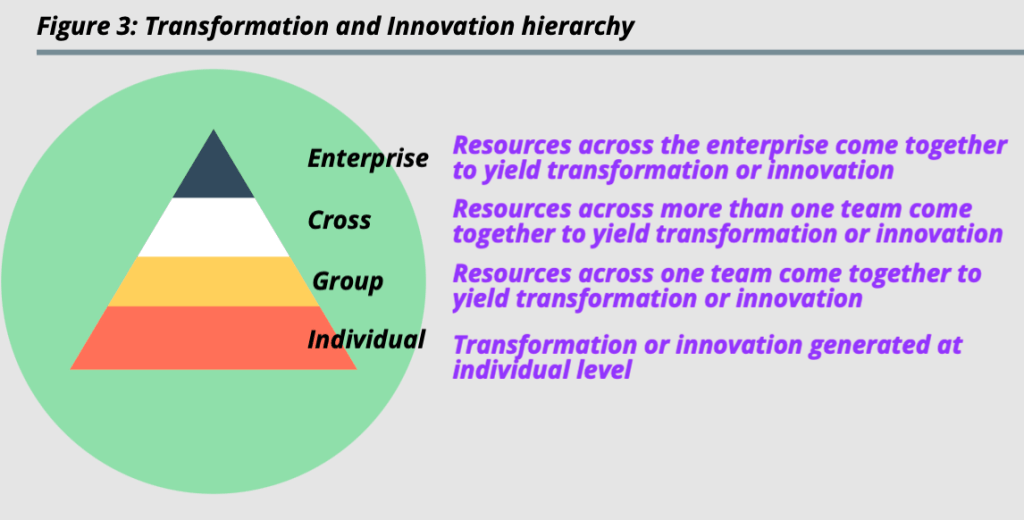 And that individual innovation, sits at the bottom of the hierarchy of transformation and innovation. The operational innovation and transformation hierarchies are shown in Figure 3. We have an understanding of the individual contribution layer from the example we discussed. Let us explore the remaining layers.