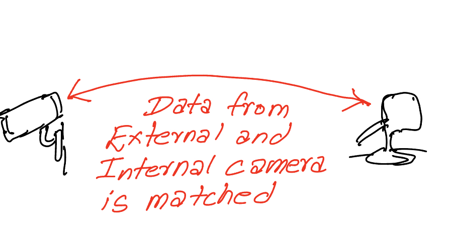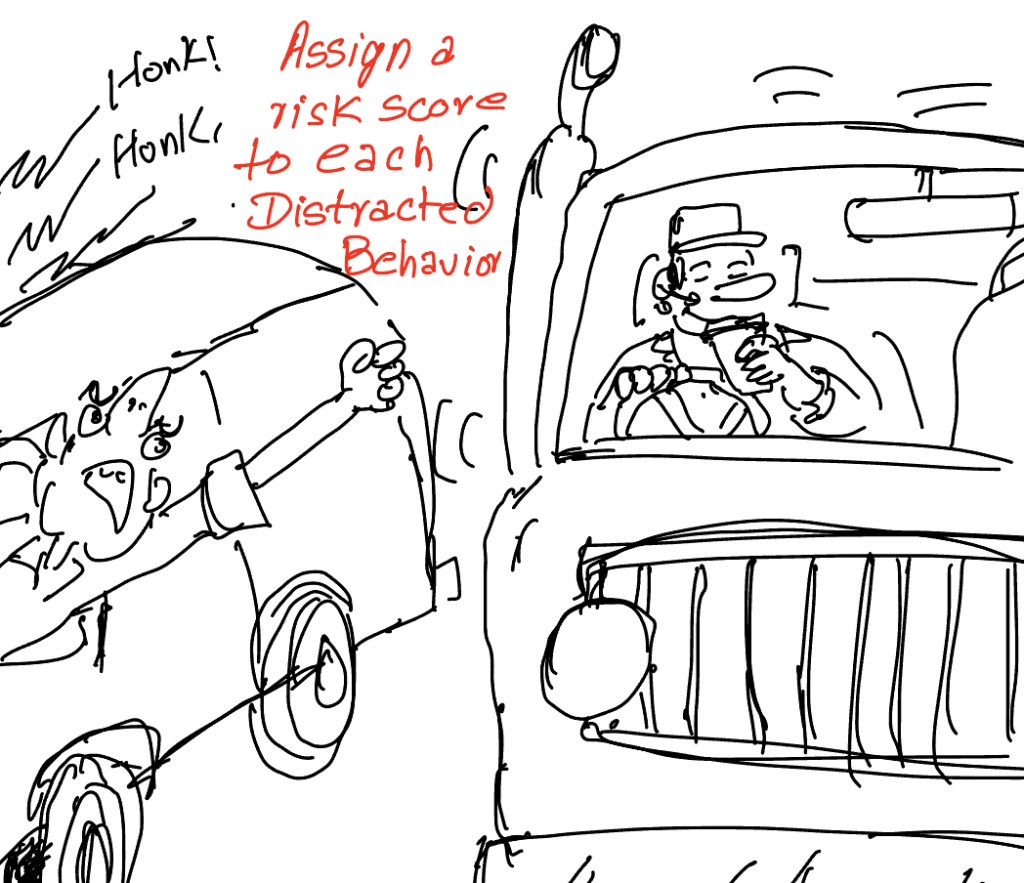 Based on the behavior data from the internal camera, and the external camera data, a risk score for every distractive behavior can be calculated. An example is the driver reaching out to grab something when in heavy traffic. Also, the truck swayed a bit into the other lane. Time stamped data from external and internal camera can reconcile these two events, hence providing data, to both illustrate, as well as quantify, the risk of distraction.