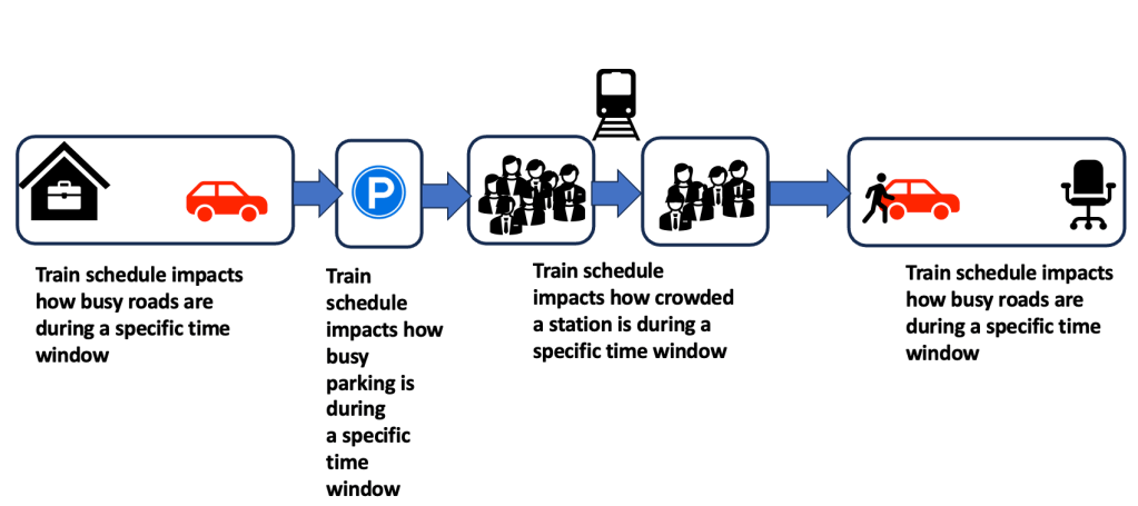 With data on where commuters live, the stations they use, and the schedule of the train they take, the first step of the process, shown in the above illustration, can be optimized further. Urban transportation planning leverages real-time traffic flows to operate traffic lights. The normal train schedule gets automatically baked into the traffic flow data as the traffic increases when these commuters leave their homes for the train station, during rush hours. But can you leverage this information to “incentivize” commuters to take routes that will distribute traffic away from busier streets?