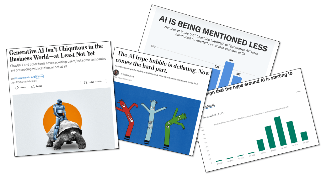 Unlike last two AI winters, this time we have the necessary capabilities, more than needed to realize the hype into reality. But this also raises the stakes. Billions of Dollars of investment is now banking on the fact that the current trajectory will sustain. We have to remember that the explosive growth in advancing AI capabilities is fueling turbocharged growth in many other areas, like chip making. It is ok for hype to wind down and transform into real-world applications. But that part, labeled as the “hard part” by The Wahington Post, the part where the hyped capabilities transform into real-world applications is happening at an alarmingly slow pace. And if that pace does not accelerate, there may be challenges.