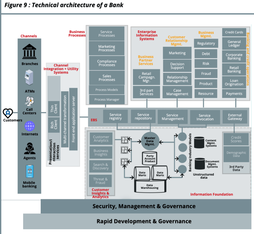 For this final chapter, we will use an example of a bank. A typical SOA-based architecture of a bank has been shown in Figure. We will leverage one element from this to highlight how organizations can think about redesigning their architecture for a mix of agility and efficiency.
