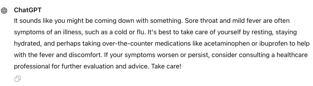 When we are in pain and feeling under the weather, the last thing we want to do is to go through a couple of holds on a phone call and explain whyand then your symptoms we are calling to multiple people. And to be candid, you know how many times you have called your physician’s office with such symptoms just to have the nurse tell you to take OTCs and wait and watch for 48 hours. But the good news is that the provider now has a LLM model that can provide the same insights. That LLM model will obviously be customized and will have many legal disclaimers. But the suggestion, when you explain your symptoms, will still be on the lines of what ChatGPT suggests: