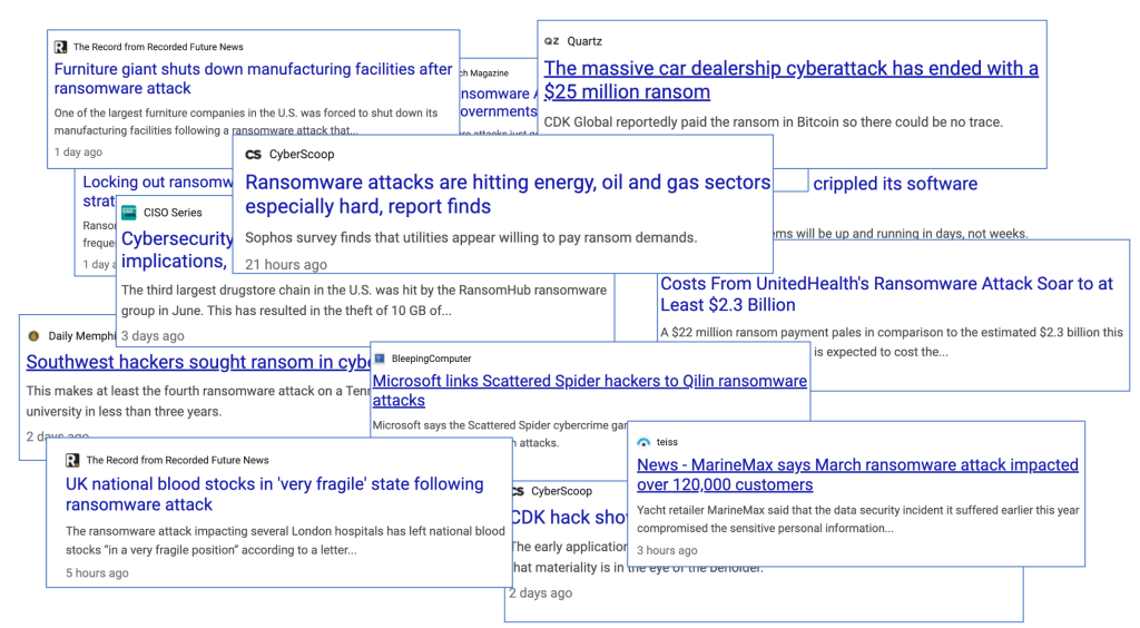 The collage below captures signed security-related incidences in just the last week, most of them being ransomware attacks. Ransomware remains one of the biggest challenges in cybersecurity. And it remains so from two perspectives. First, with the current approaches to attack detection and prevention, it is very difficult to detect and completely eliminate the risk of ransomware attacks. Second, once the attack has been executed, there is currently no approach to decrypt the data without paying the ransom. As you may know, most ransomware attacks basically encrypt critical data, and encryption is removed only after companies pay a ransom.