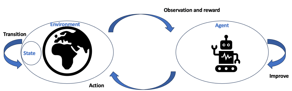 As you see in the illustration, the cycle starts when the agent observes the environment. Based on the observation, the agent leverages the reward to improve the objective it is focused on. The agent then performs an action on the environment, in an attempt to change the state in a favorable way. Finally, the environment transitions and changes its state as a result of the previous state and the agent’s action. Then the cycle repeats.