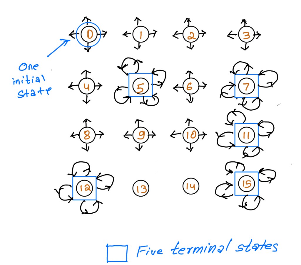 In our frozen lake instance recall that we have one starting state which is the stage 0 and five terminal states which are basically the holes in the icy surface of the frozen lake 😁.