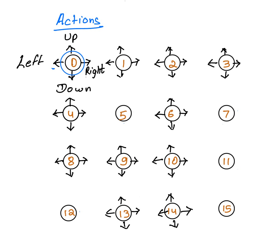 As we can imagine the set of all available actions is known in advance. The agent can then decide to select actions based on deterministic or stochastic analysis. Note that this does not mean that the environment reacts deterministically or stochastically to agents actions. The gist here is that agents can either select actions from a table or from pre-state probability distributions. In our frozen lake environment, actions are singletons representing the direction the agent tries to move to, which is four (up, down, left and right). So we can say that the number of variables for the action is just one, which is the direction of the move and the size of the action space is four (number of directions in which the agent can move).
