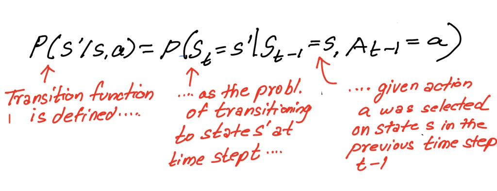 We know that an environment changes as a response to actions. The way this change is captured mathematically is known as state transition probabilities, or as we defined it more simply in one of the early parts of this article, the transition function. The transition function is denoted by T(s,a,s’). It maps a transition tuple of s, a and s’ to a probability. What this means is that the transition function captures the following scenario: When you provide a transition function the current state s, the intended state s’ and the action a, it returns the probability of transitioning to state s’. The mathematical representation of the transition function is shown below.