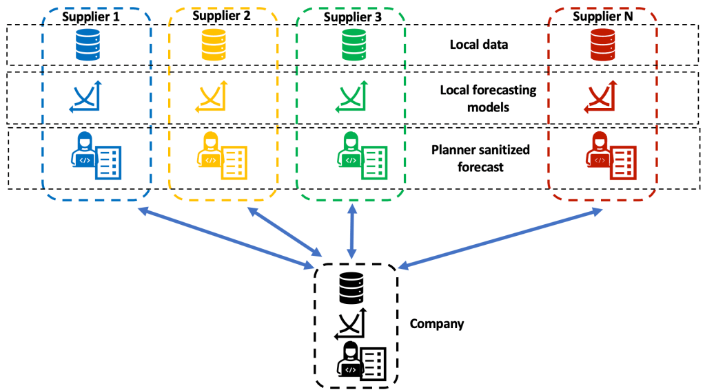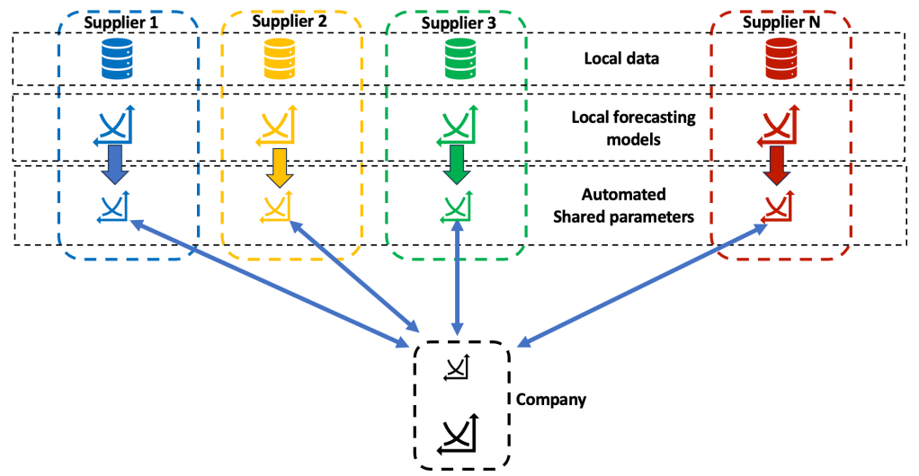 The automated parameters sharing aspect takes a human planner out of the loop. However, the model development, specifically the model that extracts parameters to share from the full forecast, still needs to overcome some trust aspects to implement this at key suppliers. The suppliers will still need to know what data or parameters these models will send to the central server at the company. They need to be provided complete visibility into the architecture so that they trust that nothing that they do not want to be shared or that can not be shared is being shared with the company.